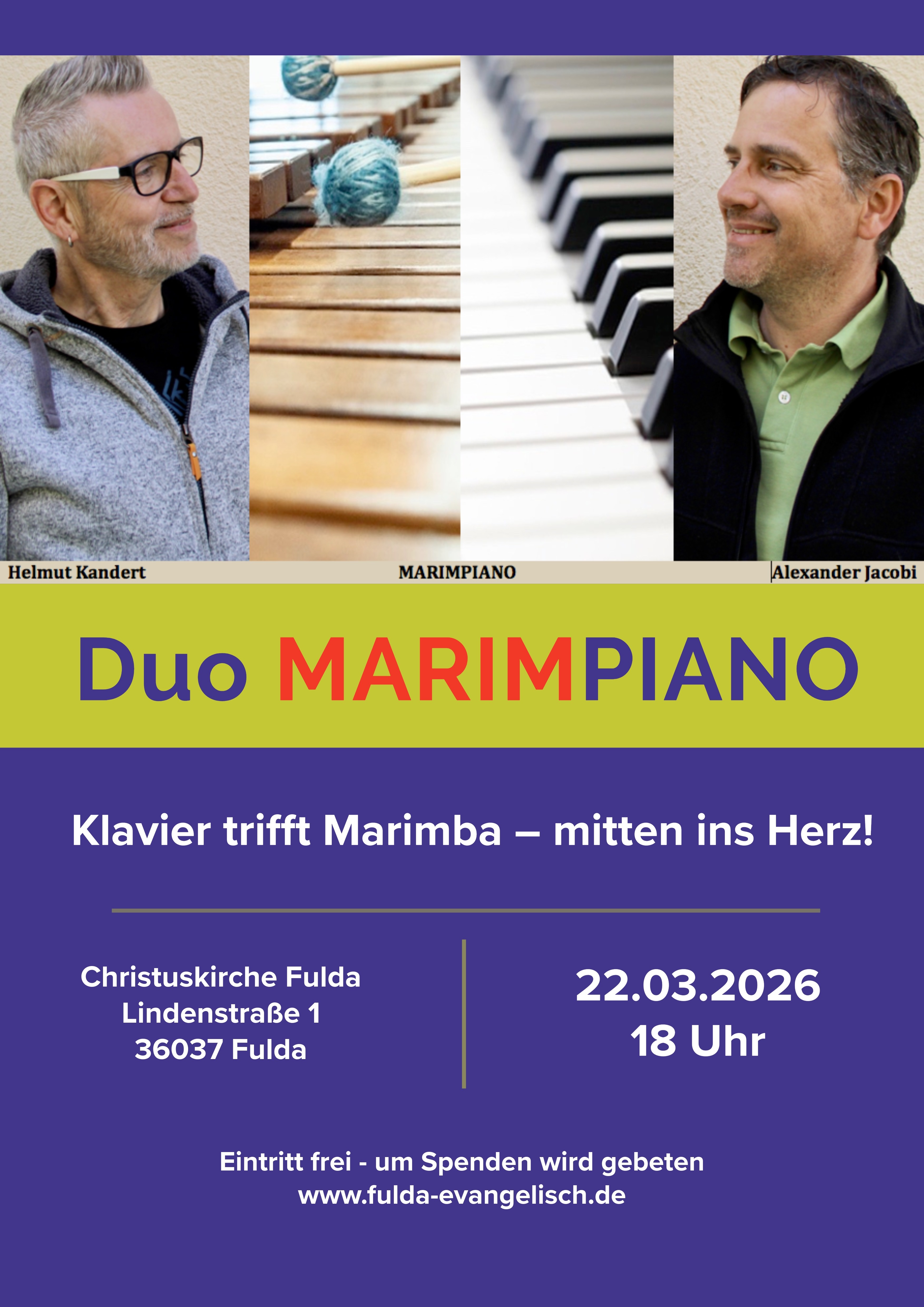 Die ungewöhnliche Duo-Formation Marimpiano wurde 2017 von Alexander Jacobi und Helmut Kandert gegründet. Ihre Experimentierfreude und Spielfreude kennt keine stilistischen Grenzen. Altehrwürdige Kirchenchoräle stehen ebenso auf dem Programm wie bekannte Werke der Klassik. Selbst Johann Sebastian Bach erklingt in einem neuen Gewand, wenn ein Fugenthema auf dem Marimbaphon zu einem temperamentvollen Salsa-Rhythmus wird. Die Musiker moderieren das Programm selbst humorvoll und führen das Publikum auf diese Weise unterhaltsam durch den Abend. Der Eintritt ist frei, um Spenden wird gebeten.